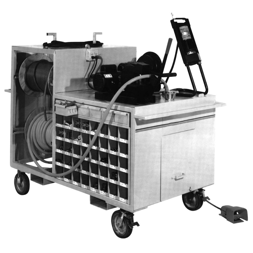 The TH7-4, is a portable all-in-one unit designed to hold a Minikrimp,   Karrykrimp, Karrykrimp 2, or Parkrimp 1; a 332T-115V Cut-off Saw; 4 reels of   hose; and has a 40 bin cabinet (both sides) with 3 drawers for tools.  The TH7-4 can be customized to fit your specific hose assembly needs.